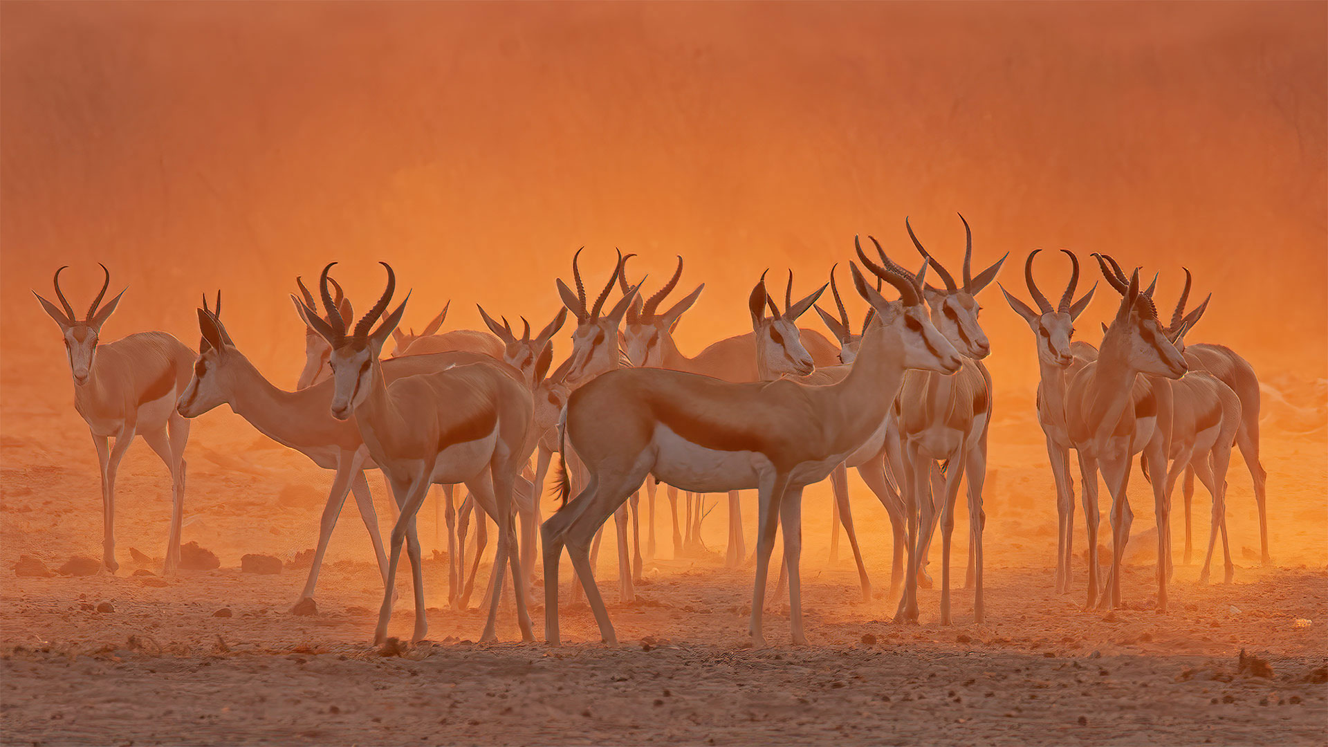 Springboks near a waterhole in Etosha National Park, 纳米比亚 (© Charlie Summers/Minden Pictures)